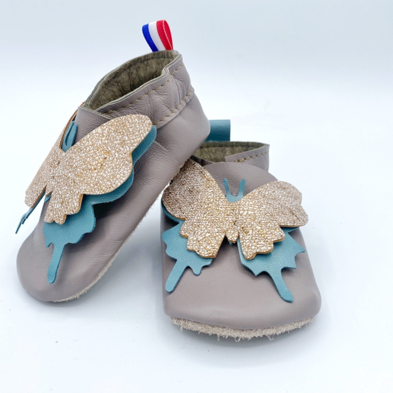 Chaussons en cuir couleur taupe et papillon doré